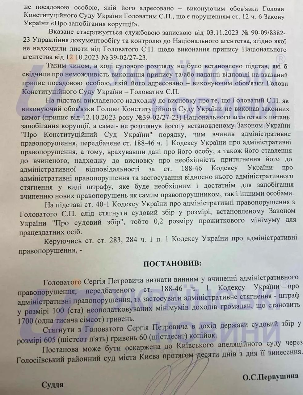 Голосеевский суд Киева признал виновным и.о. главы Конституционного суда Сергея Головатого за отказ предоставить НАПК (Национальное агентство предотвращения коррупции) запрашиваемые документы.