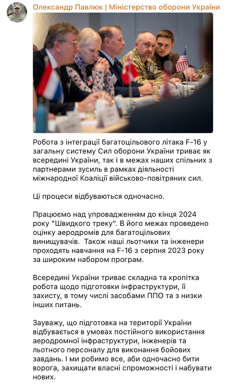 "Наши летчики и инженеры проходят обучение на F-16 с августа 2023 года по широкому набору программ", - написал он.