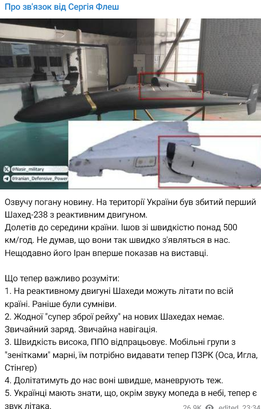 На территории Украины был сбит первый беспилотник "Шахед"-238 с реактивным двигателем.