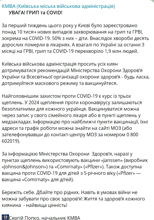 "Самой главной защитой против COVID-19 является курс из трех прививок. В 2024 году прививки против коронавируса остаются бесплатными для каждого украинца. Вакцинироваться можно через запись у своего семейного врача или в пункте прививок в медучреждениях", - напоминают в КГВА.