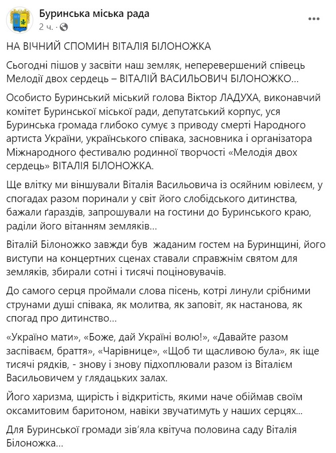 На 71-м году жизни умер народный артист Украины Виталий Билоножко.
