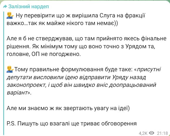 "Проверить, что же решила "Слуга" на фракции, тяжело… так как почти никого там нет. Но я бы не утверждал, что там принято какое-нибудь финальное решение. Как минимум потому, что оно точно с правительством и, главное, ОП не согласовано", – написал Железняк в телеграм-канале.