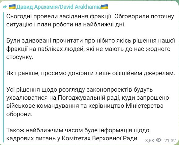 "Сегодня провели заседание фракции. Обсудили текущую ситуацию и план работы на ближайшие дни. Были удивлены прочитать о якобы каких-то решениях нашей фракции в пабликах людей, не имеющих к нам никакого отношения", – заявил Арахамия.