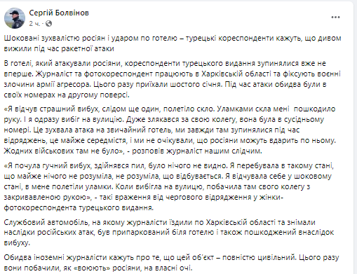 "Чудом выжили". Турецкие корреспонденты рассказали, как спаслись при ракетном ударе по их отелю в Харькове