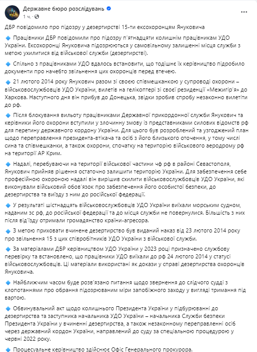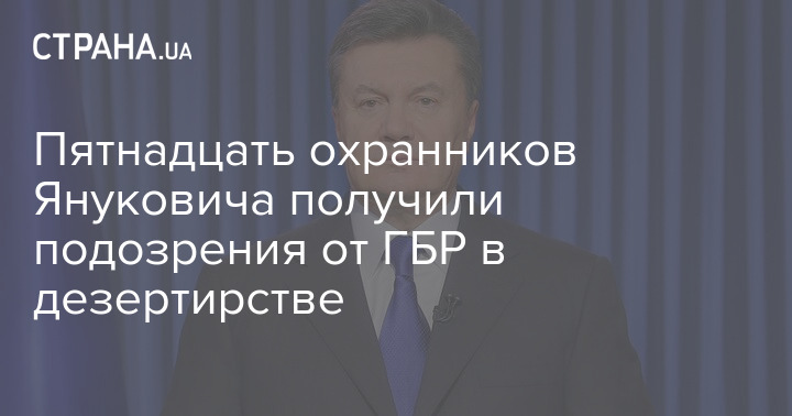 Государственное бюро расследований (ГБР) сообщило о подозрении 15 охранникам экс-президента Виктора Януковича. Бывших работников управления госохраны обвиняют в самовольном оставлении места службы с целью дезертирства.