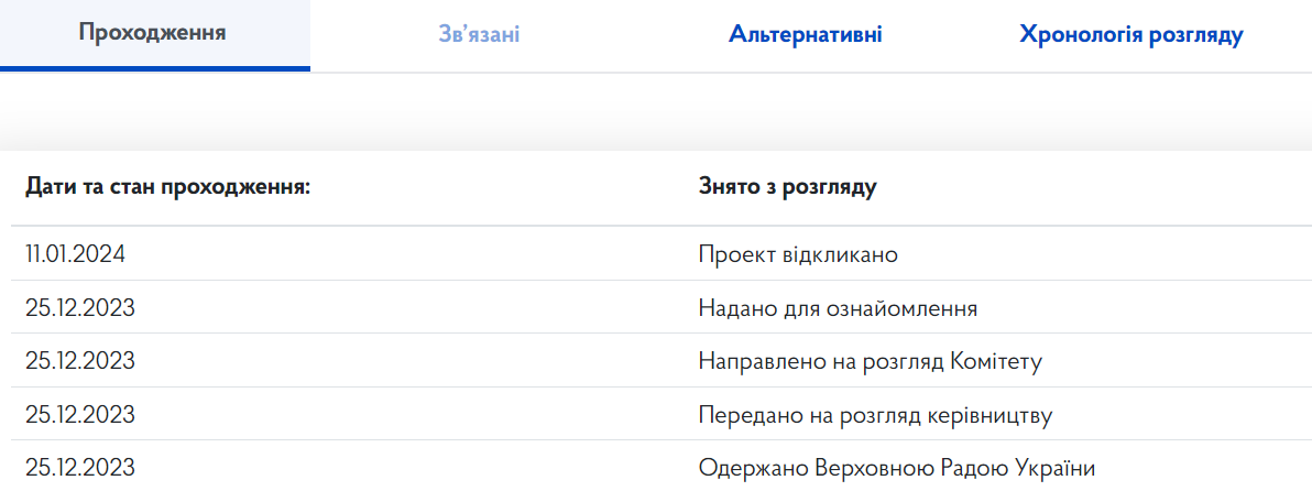 На сайте парламента законопроект о мобилизации уже получил статус "Проект отозван".