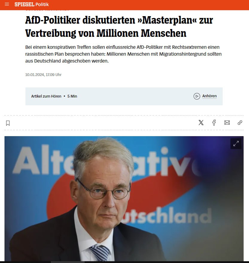 По информации журнала, в конце ноября на встрече в отеле в Потсдаме влиятельные политики из партии "Альтернатива для Германии" (АдГ) вместе с другими представителями крайне правых сил обсуждали, как они могут депортировать или вытеснить людей с миграционным прошлым, даже если они уже являются гражданами Германии.