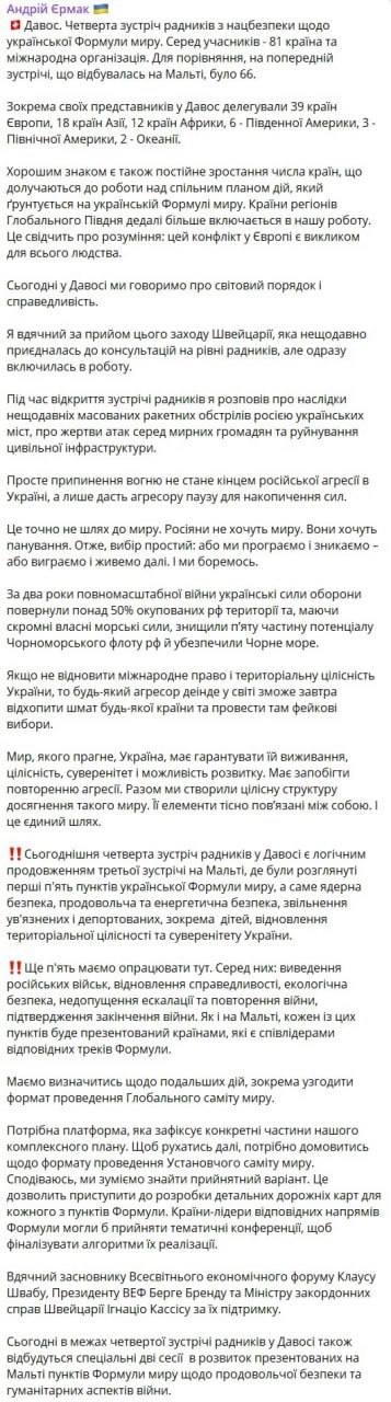 Глава Офиса президента Андрей Ермак заявил о начале встречи в швейцарском Давосе советников лидеров 81 стран и международных организаций для обсуждения украинской формулы мира.
