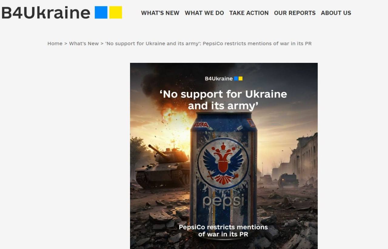 Американская компания PepsiCo в своей рекламе запретила упоминать о войне в Украине. Об этом сообщает глобальная коалиция общественных организаций B4Ukraine.