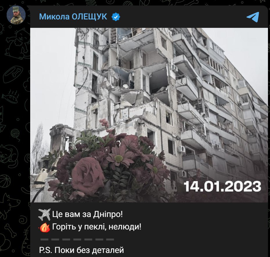 При этом сегодня утром командующий Воздушных сил ВСУ Николай Олещук выпустил пост, в котором написал "Это вам за Днепр!" (вчера была годовщина прилета по многоэтажке в Днепре) и добавил эмодзи с самолетом. Он также написал, что "пока без деталей".