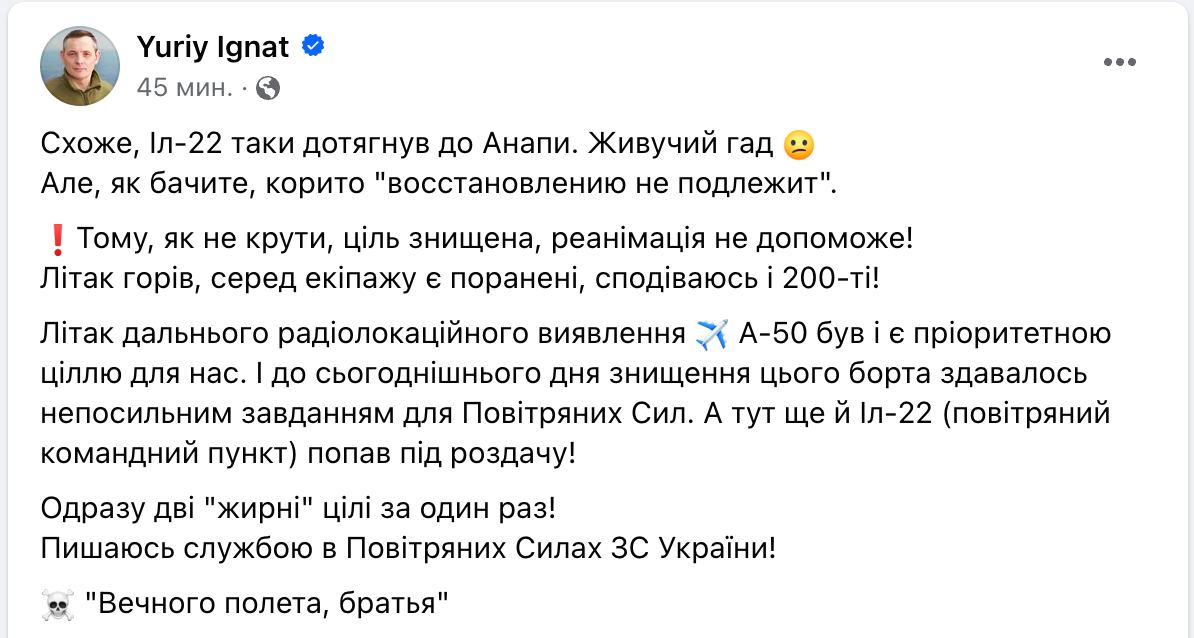 Он также добавил, что среди экипажа есть раненые. По словам Игната, до сегодняшнего дня уничтожение самолета дальнего радиолокационного обнаружения А-50 "казалось непосильной задачей" для ВСУ, но удалось сбить "сразу две "жирные" цели за один раз.
