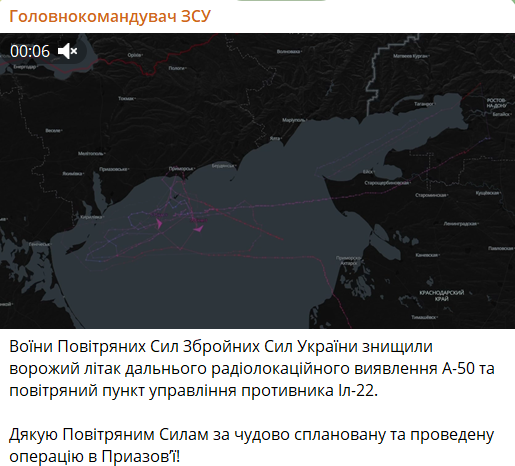 Главком ВСУ Валерий Залужный сообщил, что Воздушные силы уничтожили российский самолет дальнего радиолокационного обнаружения А-50 и воздушный пункт управления Ил-22 над Азовским морем.