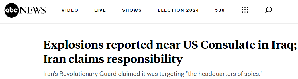 Телекомпания ABC со ссылкой на источники сообщила, что восемь объектов возле американского консульства в городе Эрбиль подверглись атакам Корпуса стражей исламской революции.