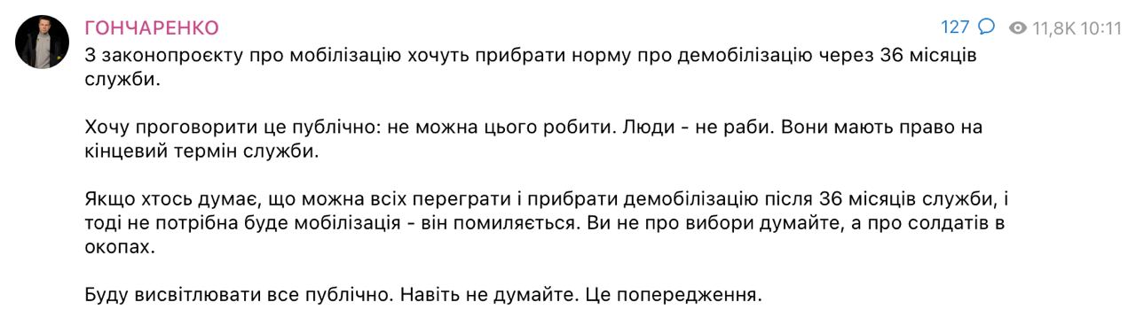 «Люди не рабы. Они имеют право на конечный срок службы. Если кто думает, что можно. Всех переиграть, убрать демобилизацию после 36 месяцев и тогда не нужна будет мобилизация - он ошибается», - заявил Гончаренко.