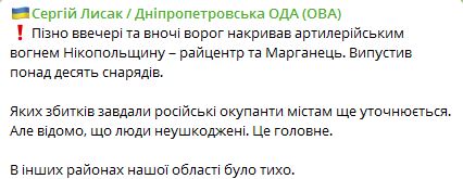 07.35 Ночью армия РФ выпустила десяток снарядов по Никопольскому району Днепропетровской области. Последствия обстрела уточняются.
