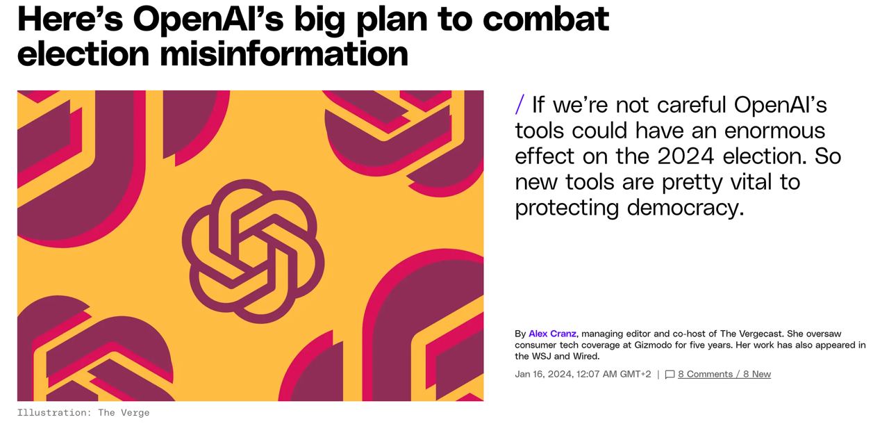 В OpenAI заявили, что пользователи ChatGPT начнут видеть новости со всего мира в реальном времени с указанием авторства и ссылками. А когда пользователи будут задавать процедурные вопросы, связанные с голосованием, их станут направлять на официальный ресурс голосования CanIVote.org.