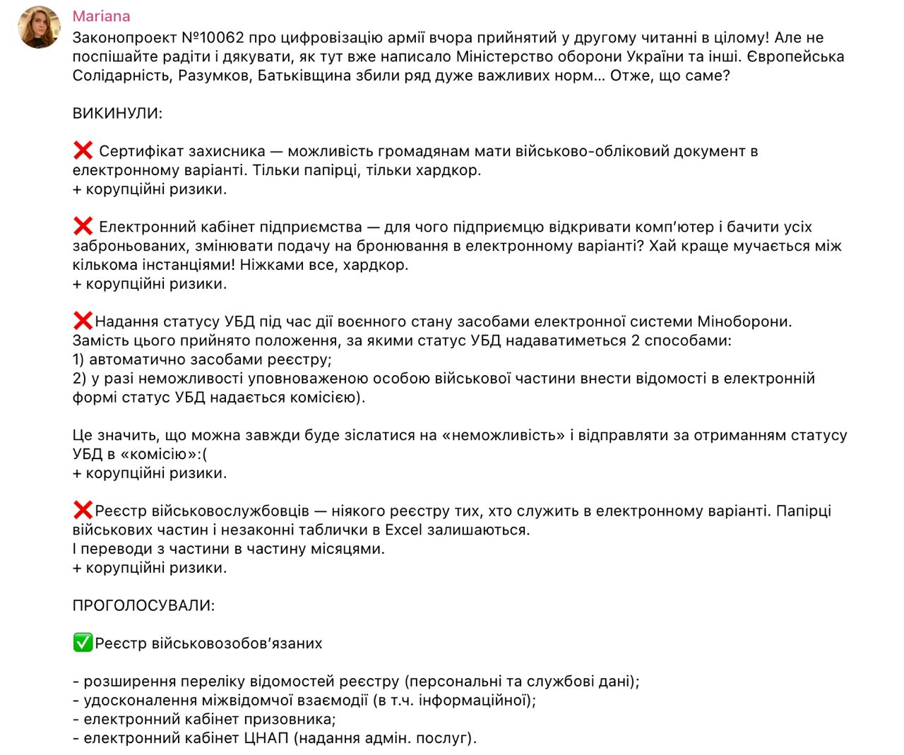 "Никакого реестра тех, кто служит, в электронном варианте. Бумажки воинских частей и незаконные таблички в Excel остаются", - пишет она.
