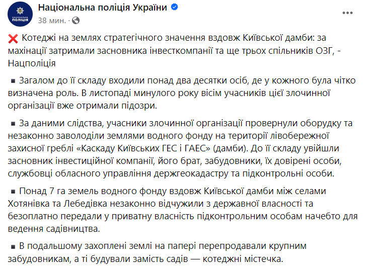 Нацполиция, не называя имен, сообщила, что основателя инвесткомпании "и еще трех подельников" задержали за махинации с землей стратегического значения вдоль Киевской дамбы.