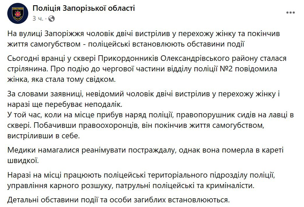 Сегодня в центре Запорожья произошла стрельба. Мужчина дважды выстрелил на улице в случайную прохожую и затем покончил с собой.