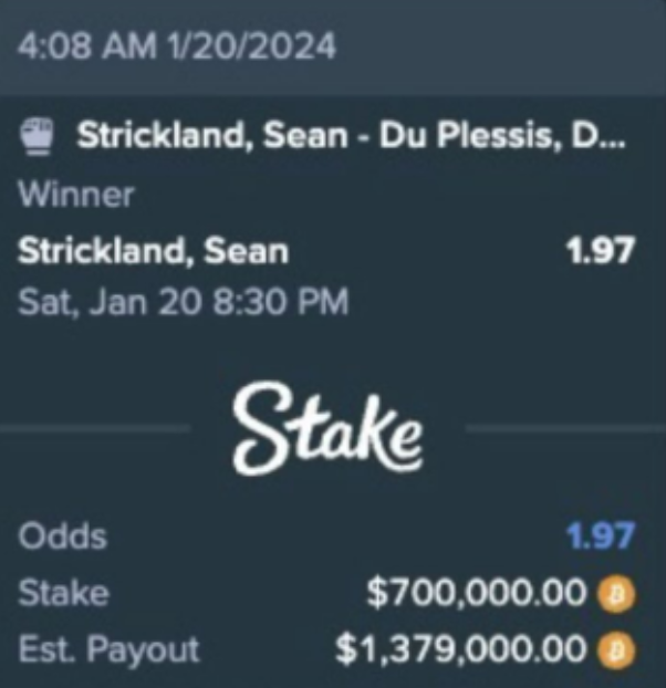 Накануне Дрейк сообщил в соцсетях, что сделал ставку в размере 700 тысяч долларов и с коэффициентом 1,97 на победу Шона Стриклэнда перед его первой защитой титула в среднем весе на турнире UFC. Однако спортсмен раздельным решением судей потерял чемпионский пояс, а рэпер - деньги. За поражением своего фаворита Дрейк лично наблюдал со зрительских мест в канадском Торонто.