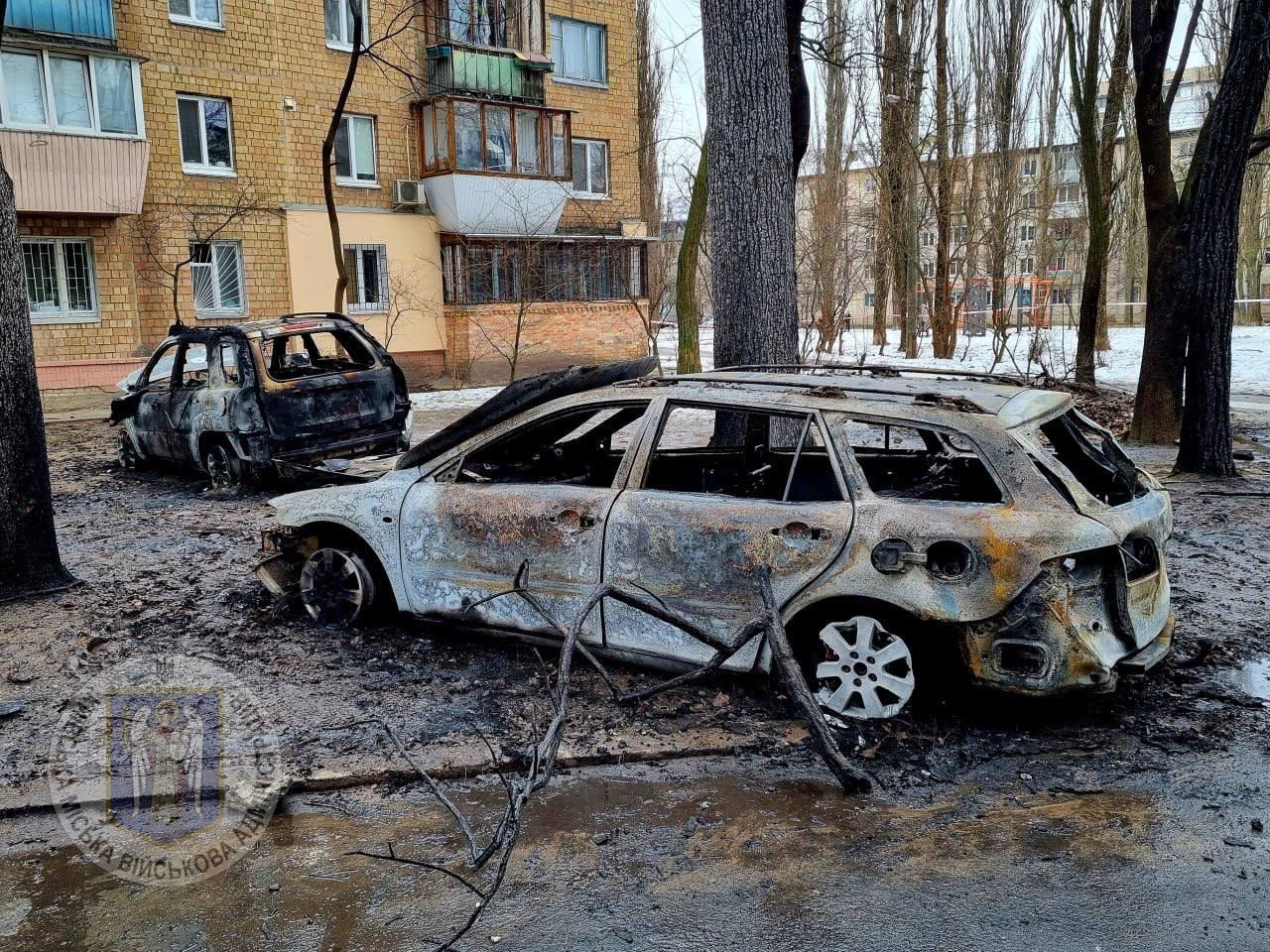 07.38 Горящие автомобили в Святошинском районе Киева после ракетной атаки.