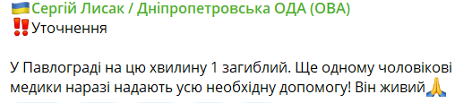 "В Павлограде на эту минуту один погибший. Еще одному мужчине медики оказывают всю необходимую помощь", - написал он.