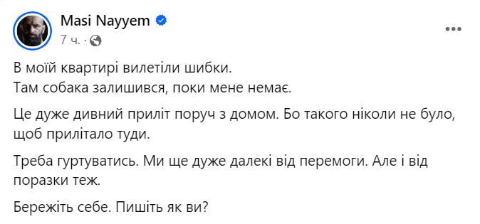 "У моей машины люк пробило. Во всех комнатах выбило стекла. Хорошо, что все наши живы и не поранились. Соболезнование тем, у кого хуже", - написал Маси Найем.