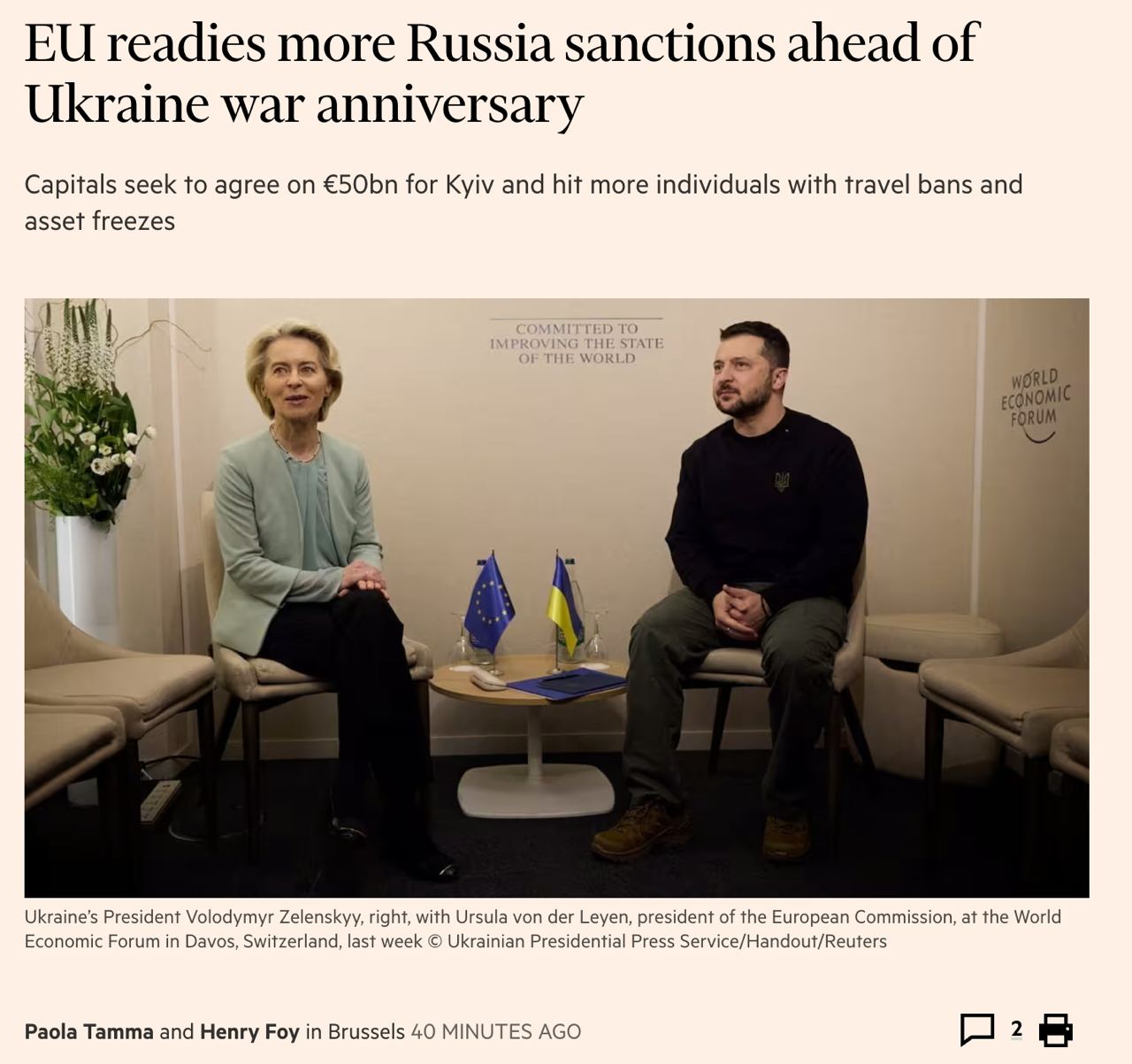 13.40 ЕС хочет к второй годовщине вторжения РФ одобрить выделение Украине 50 млрд евро помощи, первые 5 млрд доходов от замороженных российских активов и 13-ый пакет санкций, пишет Financial Times.