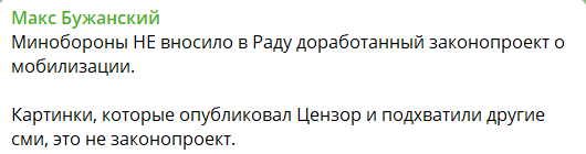 Народный депутат Максим Бужанский пишет, что Минобороны "НЕ вносило в Раду доработанный законопроект о мобилизации".