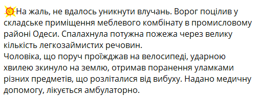 "К сожалению, сбитые дроны по инерционной траектории долетали до жилых кварталов. Один из них, попав в частично заселенную многоэтажную новостройку в Хаджибейском районе Одессы, вызвал пожар. Повреждены несколько квартир, один человек получил ожоги, госпитализирован.