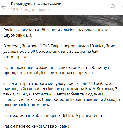 Об этом сообщил командующий оперативно-стратегической группировкой войск "Таврия" Александр Тарнавский в своем телеграм-канале.
