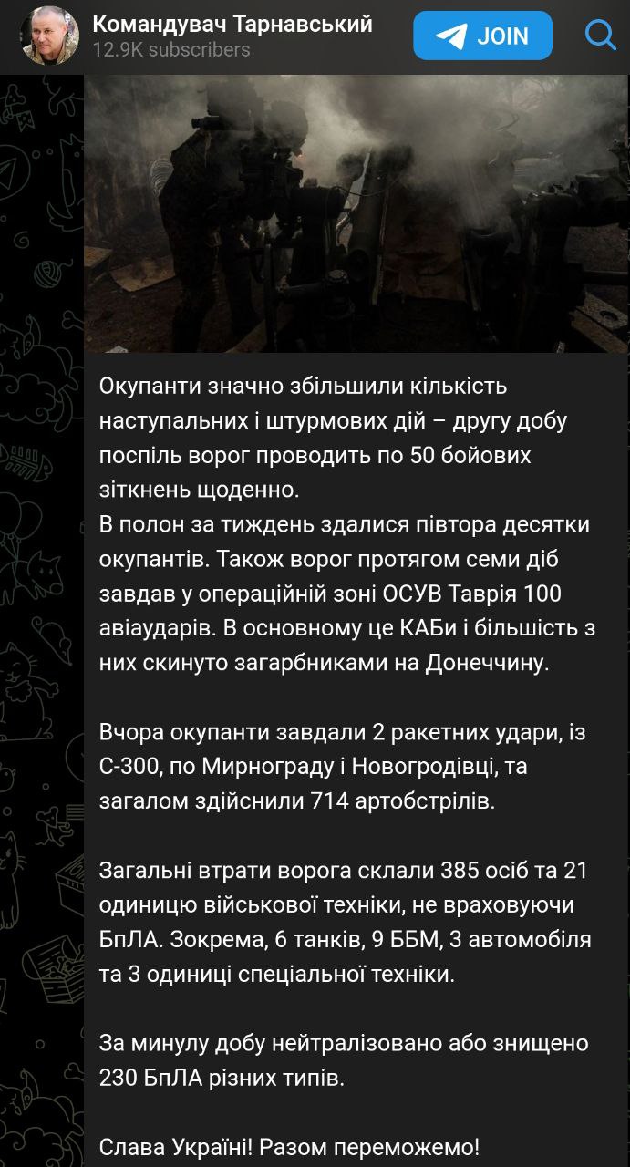 "В плен за неделю сдались полтора десятка окупантов. Также враг в течение семи суток нанес в операционной зоне ОСУВ Таврия 100 авиаударов. В основном это КАБы и большинство из них сброшены захватчиками на Донетчину", - сообщает он.