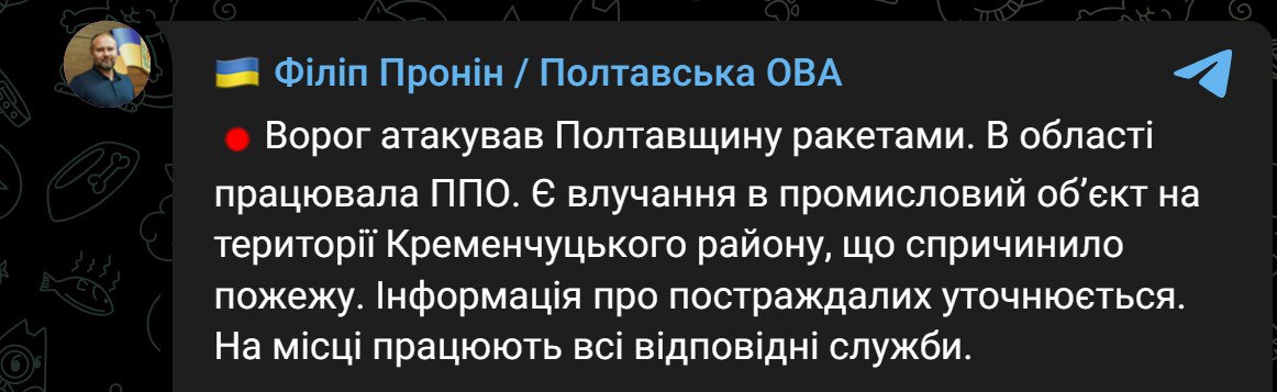 Об этом сообщил 27 января глава Полтавской областной военной администрации Филипп Пронин в своём телеграм-канале.