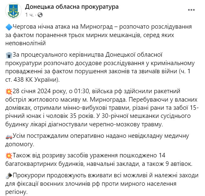 "28 января 2024 года, в 01:30, войска РФ произвели ракетный обстрел жилмассива г. Мирнограда. Находясь в собственных домах, получили минно-взрывные травмы, резаные раны и ушибы 15-летний юноша и мужчина 35 лет. У 30-летней жительницы соседнего дома врачи диагностировали черепно-мозговую травму" - говорится в сообщении.