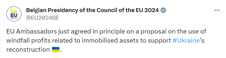 "Послы ЕС только что достигли принципиального согласия по предложению об использовании сверхприбыли, связанной с замороженными активами, для поддержки восстановления Украины", - говорится в сообщении.