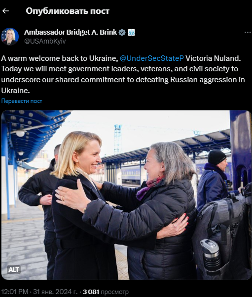 Об этом 31 января сообщает посол США в Украине Бриджит Бринк в соцсети Х.