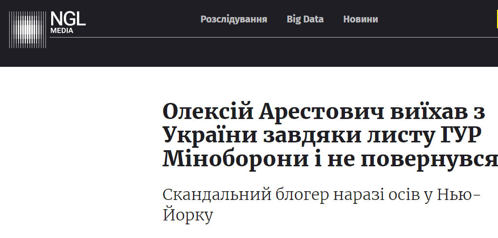 Издание NGL media сообщило, что экс-советник Офиса президента Алексей Арестович уехал за границу пять месяцев назад на основании письма от ГУР и не вернулся.