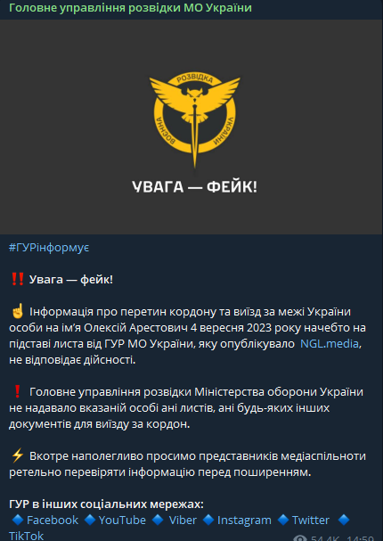 ГУР в ответ заявило, что это фейк, и никаких документов для выезда за границу Арестовичу не выдавали.