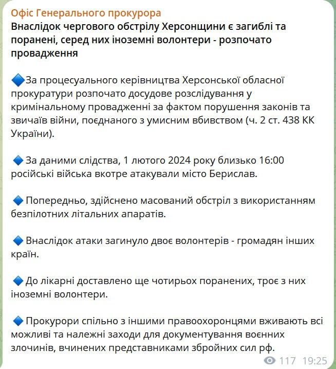 В четверг, 1 февраля, в результате дневного обстрела Берислава Херсонской области погибли двое иностранных волонтеров.
