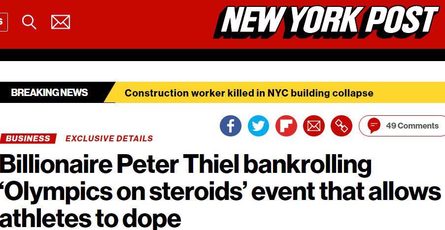 Американский предприниматель и один из основателей электронной платежной системы PayPal Питер Тиль профинансирует "Олимпийские игры на стероидах", на которых спортсменам будет разрешен допинг.