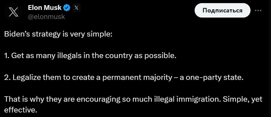 - Легализовать их, чтобы создать постоянное большинство – однопартийное государство. Вот почему они поощряют так много нелегальной иммиграции. Простой, но эффективный способ", - написал Маск.