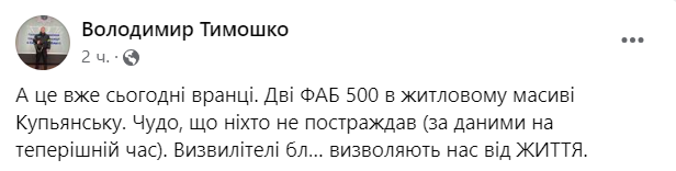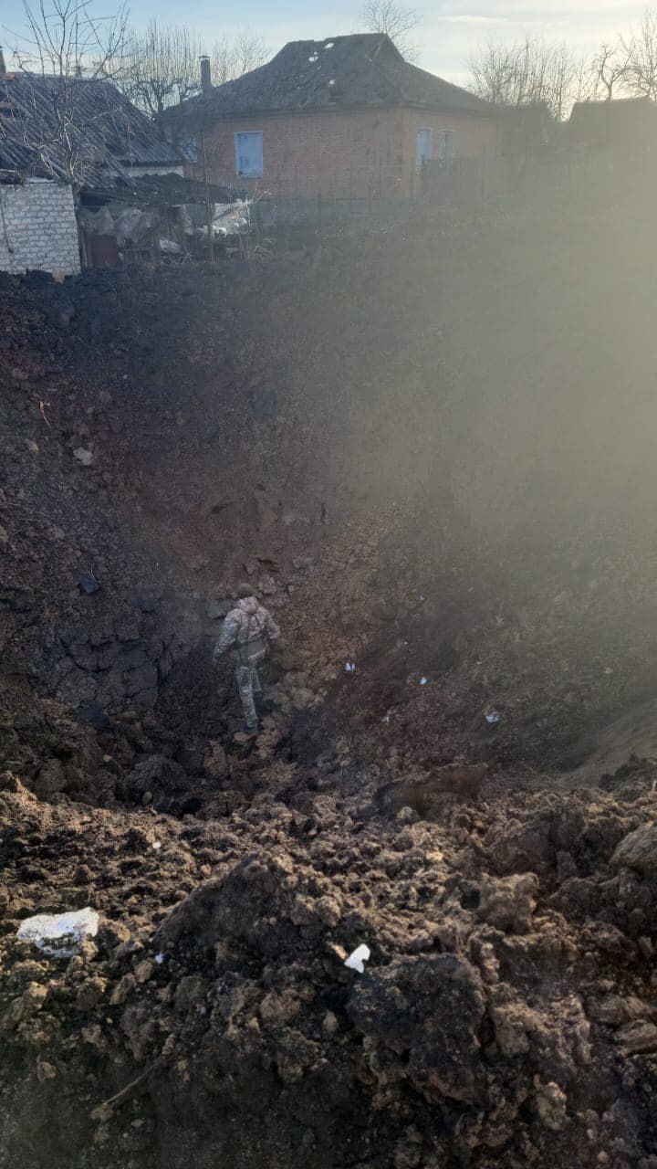 "На месте попадания образовалась огромная воронка. Повреждены линия электропередач, девятиэтажка, не менее 10 домов", - написал Тимошко.