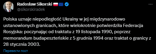 После слов Дуды глава МИД Польши Радослав Сикорский заявил, что "Польша признает независимость Украины в ее международно установленных границах, которые неоднократно подтверждались Российской Федерацией".