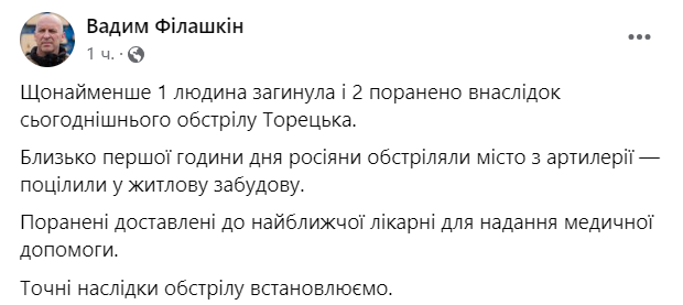 "По меньшей мере 1 человек погиб и 2 ранены в результате сегодняшнего обстрела Торецка" - написал он.