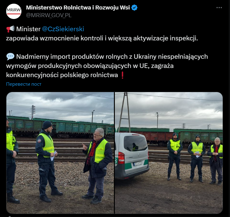 "Чрезмерный импорт сельскохозяйственной продукции из Украины, не отвечающей производственным требованиям ЕС, угрожает конкурентоспособности польского сельского хозяйства", - сообщил глава польского ведомства Чеслав Секерский.