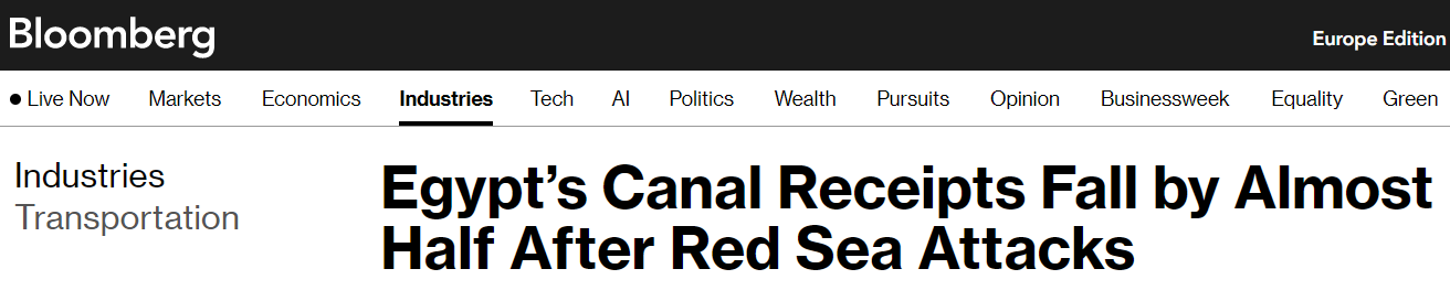 Доход Суэцкого канала упал почти вдвое из-за атак йеменских хуситов на корабли в Красном море - Bloomberg