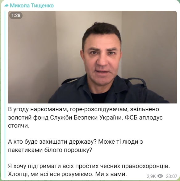 Кроме того, Тищенко считает, что такое увольнение "в угоду наркоманам, горе-расследователям" демотивирует среднее звено сотрудников спецслужбы.