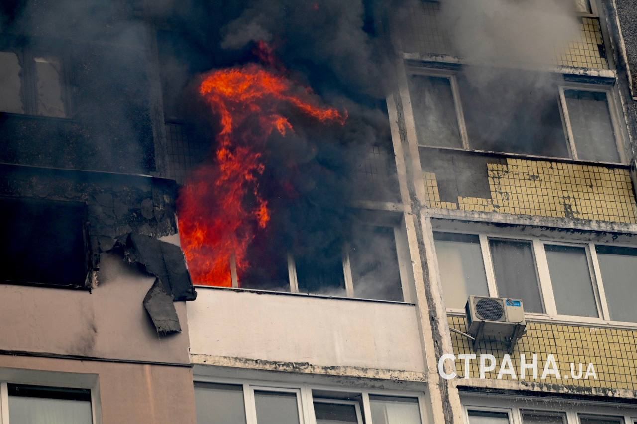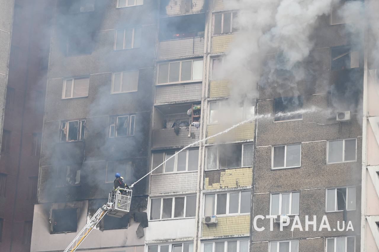 09.25 Видео с места прилета в Голосеевском районе Киева от читателей «Страны», где горит многоэтажка.