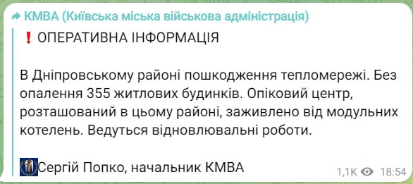 19:06 В Днепровском районе Киева повреждены теплосети, без отопления 355 жилых домов.