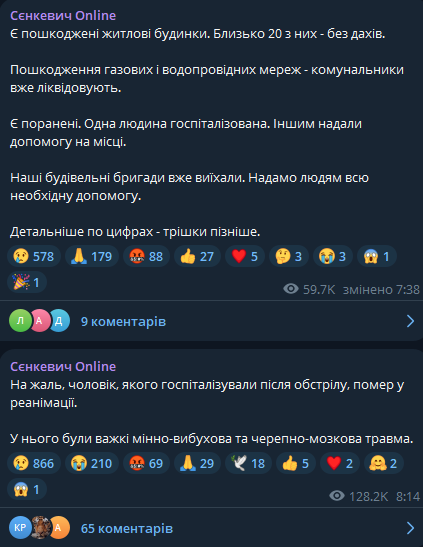 Позже Сенкевич сообщил, что пострадавший мужчина умер в реанимации.